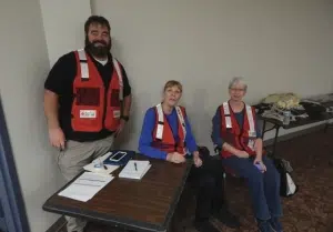 Pam Hastings and Jewel Bishop, both American Red Cross volunteers from Springfield, were helping to man the disaster center in Danville Thursday. They were accompanied by local Red Cross volunteer Scott James of Catlin.