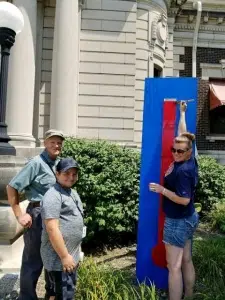 [In the photo, provided by the War Museum, two of the museum’s volunteers watch as Development Director Susan Miceli updates the Capital Campaign’s sign.]