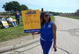 Mabel Sanchez (shown here), a quality analyst at Viscofan, was also walking the picket line. She, too, is concerned about mandatory overtime….