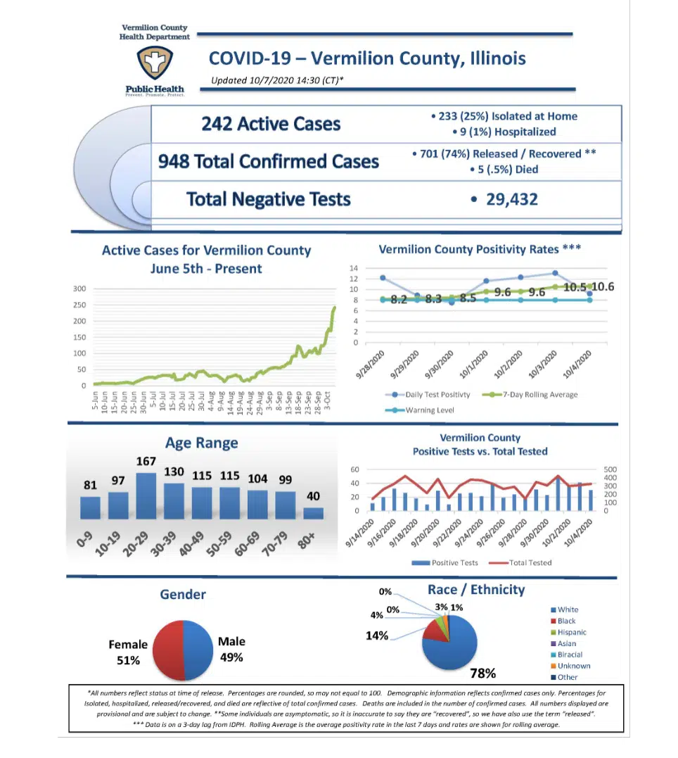 Fifteen of Wednesday’s new cases are related to previously reported positive cases. Vermilion County has now seen a total of 948 cases, and nine people are hospitalized right now with virus complications.