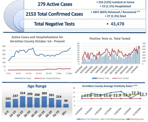 Currently, Vermilion County has 279 active cases and 23 patients in the hospital with the virus.