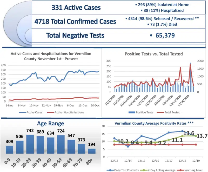 Currently, Vermilion County has 331 active cases and 38 people hospitalized with the virus. There have been a total of 4,718 positive cases since the pandemic began in March.