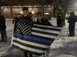 (Rebekah Holt-Miller and Shelby Schull stand with a Thin Blue Line flag outside the Public Safety Building on Saturday morning.)