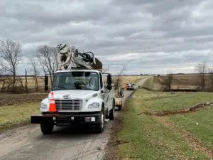 Power crews were working under contract with Ameren to replace seven damaged power poles along Vermilion County Road 2650N south of Ridge Farm (below). There were numerous other power outages from the storm across east-central Illinois and west-central Indiana.