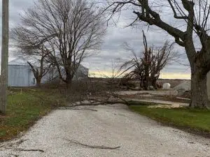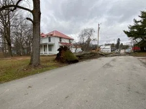 (Below) Scattered damage occurred in Kingman, IN; where the power was knocked out for a while. The storm downed tree limbs in Kingman and uprooted some large trees in the area. And damage occurred at a grain elevator where one of the large storage bins was tossed upside down where it landed on an empty vehicle.