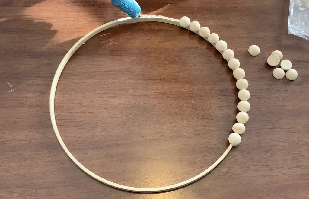 Use your glue gun and glue sticks to glue wooden half balls to wooden hoop.