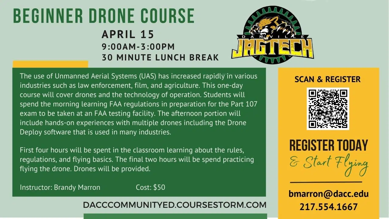 The Danville Area Community College Technology Division is holding a One-Day Course on Beginner Drone. The course will be held Saturday, April 15 from 9AM-3PM and costs $50. The course will be taught by DACC’s Brandy Marron, Associate Professor, Agriculture, Business & Technology Division.