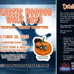 Danville Light Opera will be hosting a “Classic Horror Walk” tour of Downtown Danville, Saturday evening October 28th from 6 to 10 PM. DLO’s Paul Strain says this is definitely designed for teens and adults; and DLO is teaming up with some local experts.
