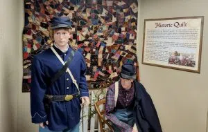 A historic quilt hangs on the wall in the 125th Illinois Infantry display. It was sewn by family members of veterans and first displayed in 1896 at a veterans reunion in Lincoln Park.