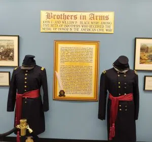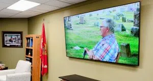 (LEFT) The Black Brothers display in the museum’s new Medal of Honor Hall. Another ten Medal of Honor recipients are also honored in the Hall. (RIGHT) A video of last year’s Taps on Tuesday is shown. It features local historian Tim Smith speaking at Atherton Cemetery.