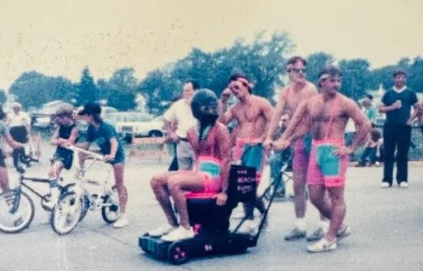 The Commode Races are just like they sound. There’s a team of four, ages 13 and up, with one rider sitting on a commode and three pushers pushing the commode on a cart. They race about a block’s length to determine a winner. The winning team receives a golden toilet trophy award.