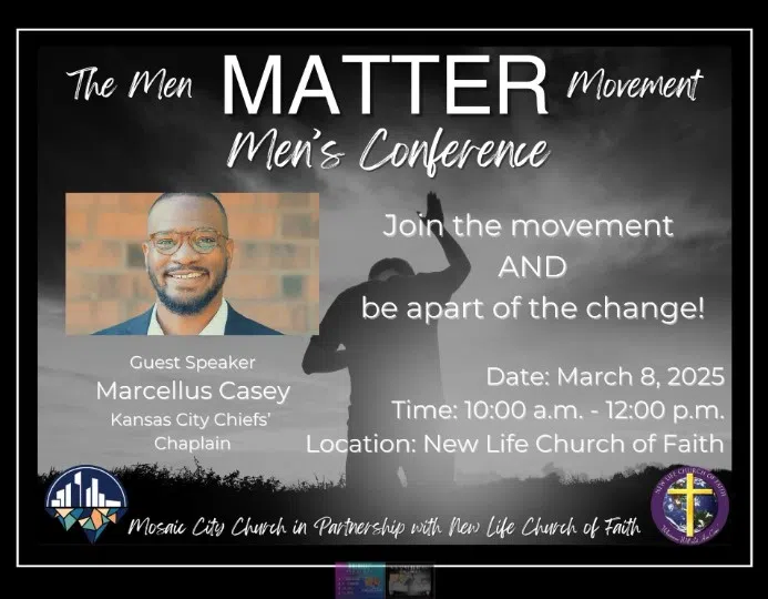 The Mosaic City Church is partnering with New Life Church of Faith in hosting this event. The Mosaic City Church’s Pastor LeStan Hoskins says this is part of the MEN MATTER MOVEMENT. And the inspirational message from the Chief’s chaplain will let men know how to join the movement, and be “part of the change” when it comes to being better fathers, husbands, and community leaders.