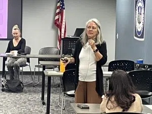 ABOVE: Rhonda Martinson, from Domestic Abuse International Programs in Duluth, Minnesota; and Martie Washington, from National Clearinghouse on Abuse in Later Life; explain a sample situation to those in attendance Tuesday morning at the Danville Police Training Center.