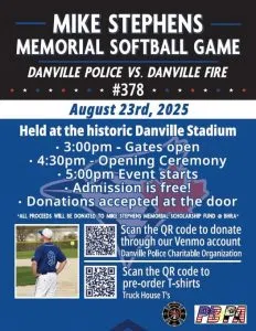 Action at Danville Stadium on August 23rd will begin with AMBUCS Challenger Baseball starting at 11:30. Gates for the event will open at 3 PM; free admission but donations welcome. Additional attractions will include bounce houses, and fireworks sponsored by Toyota of Danville. They could always use more sponsorships, volunteers, and raffle prizes for this game. So for information on that go to the link on the Danville Police Department Facebook Page: