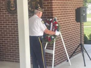 State Rep Brandun Schweizer speaks and Post 210’s Jerry Arnholt presents the wreath prior to playing of Taps.