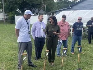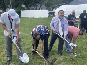 ABOVE: Executive Director for Habitat for Humanity Danville Ryan Campbell, U.S. Army Veteran Mark Whaling, Danville’s Mayor Rickey Williams, Jr; and Project Manager Robert Swider break ground for Whaling’s new home at 1416 Sherman in Danville