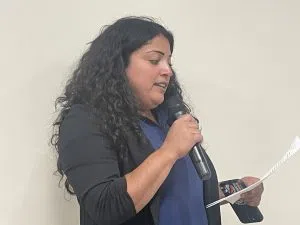 ABOVE: UFCW Local 700 president Tracy Bartak welcomes visitors to Tuesday evening’s town meeting at David S. Palmer Arena.