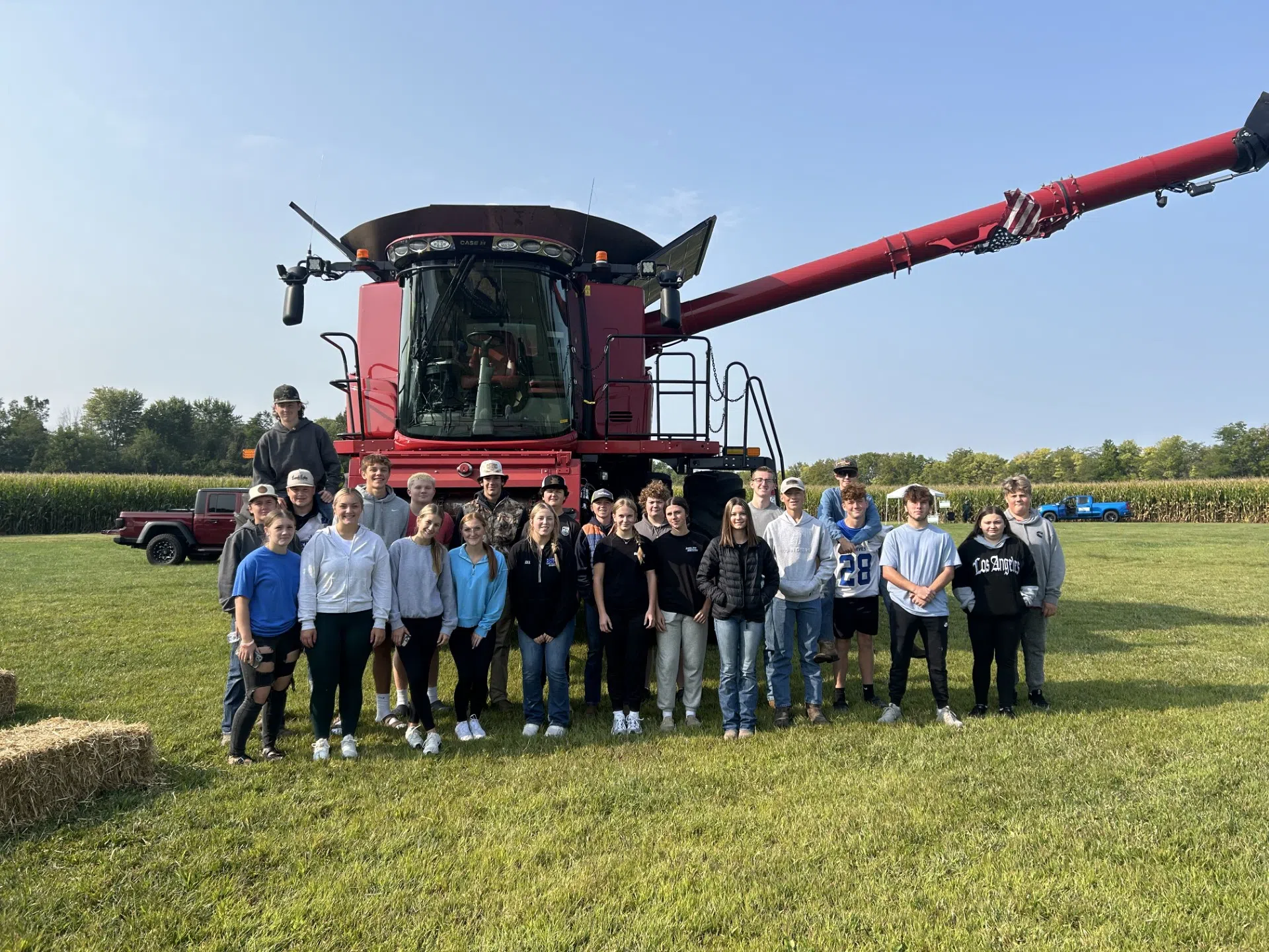 ABOVE: Bismarck-Henning Rossville-Alvin students gather before the field day in front of the Case IH combine, freshly power washed by Kaleb Such.