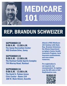 DANVILLE, IL… State Representative Brandun Schweizer (R-Danville) is announcing his Medicare 101 seminar series that he is hosting across the 104th District. Three events are scheduled during the week of September 22nd: