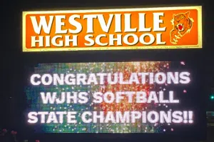 The Westville Junior High School girls softball team was welcomed home Saturday night (Sept 20th) as state champions, having won two games earlier that day to clinch the title.