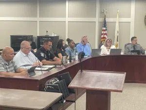 Danville Police Chief Christopher Yates (third from left) and Community Relations Administrator Rheanna Ollis (third from right) during Tuesday evening’s Danville City Council Public Services Committee meeting.