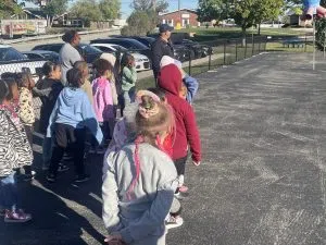 ABOVE: Danville Assistant Fire Chief Jerry Sparks speaks to students outside Liberty Elementary School.
