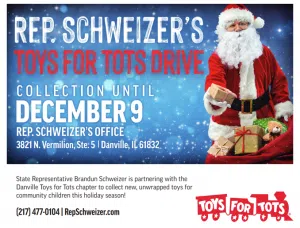 To participate, new and unwrapped toys may be dropped off at Rep. Schweizer’s district office in Danville, 3821 N. Vermilion, Ste. 5. For more information, visit danville-il.toysfortots.org.