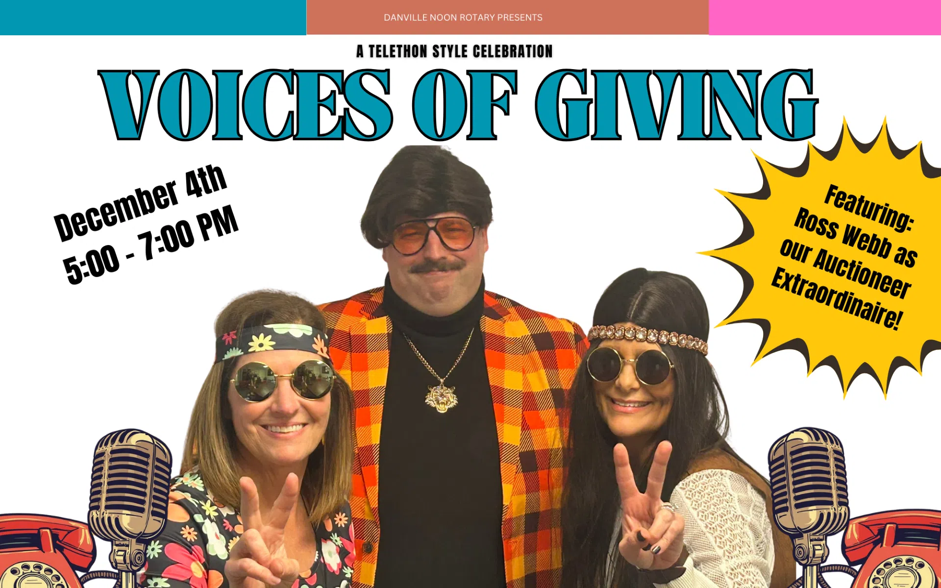 Danville Noon Rotary invites the community to step into the spotlight and get ready for a night of fun, giving, and good cheer at “Voices of Giving: A Rotary Telethon Celebration”. Formerly known as the Rotary auction, this revamped event will be held on Thursday, December 4 from 5:00 to 7:00 pm at the Danville Boat Club. The cost is $10 per person and will include heavy appetizers. There will be great music from the 70’s and a cash bar. This is a casual family-friendly event. Although it is optional, we welcome your grooviest 70’s attire!