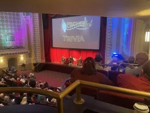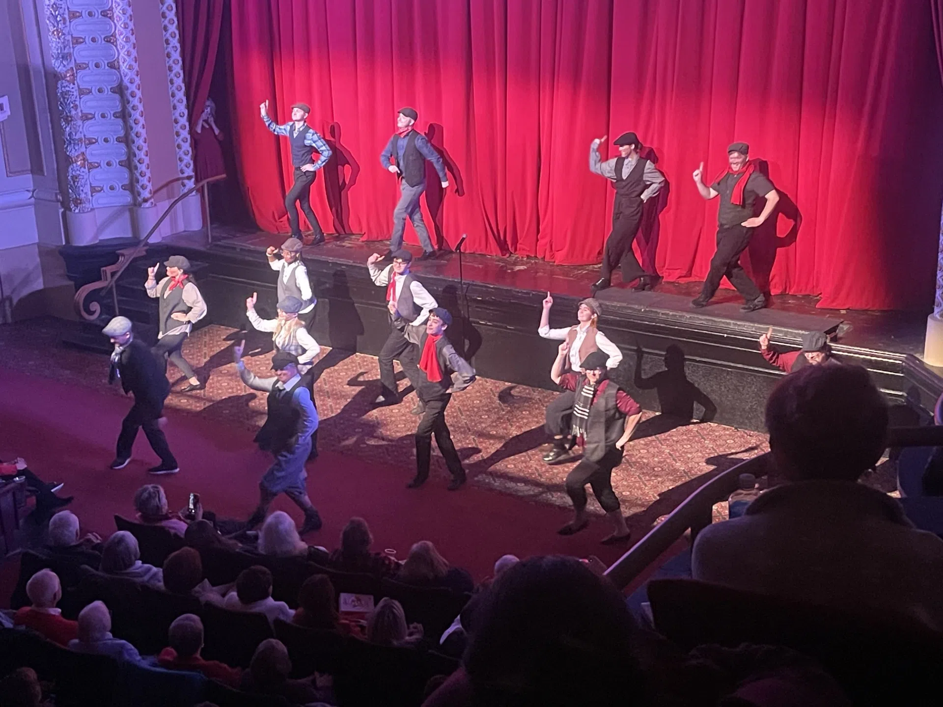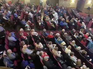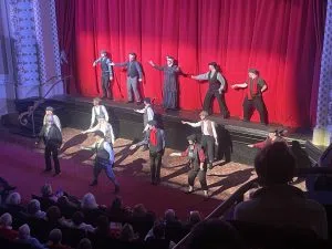 A weekend of Dick Van Dyke celebration (Dec 6th and 7th) at the Fischer Theatre’s “Van Dyke Fest,” one week ahead of his 100th birthday (Dec 13th); included the magic moment of the “Dick Van Dyke, 100th Birthday Celebration” documentary being shown for the first time, Saturday evening for a Danville audience. Included was an appearance by Danville Barbershop Chorus Director Marty Lindvahl leading a special group of “Chimney Sweeps” (above and below, Lindvahl in middle of back row in below picture) prior to the documentary’s showing.