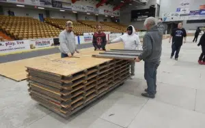 The ice surface at the David S. Palmer Arena was being transformed Friday into a basketball court. Play begins Saturday (January 13th, 2018) at the Arena in the Vermilion County Boys and Girls Basketb...