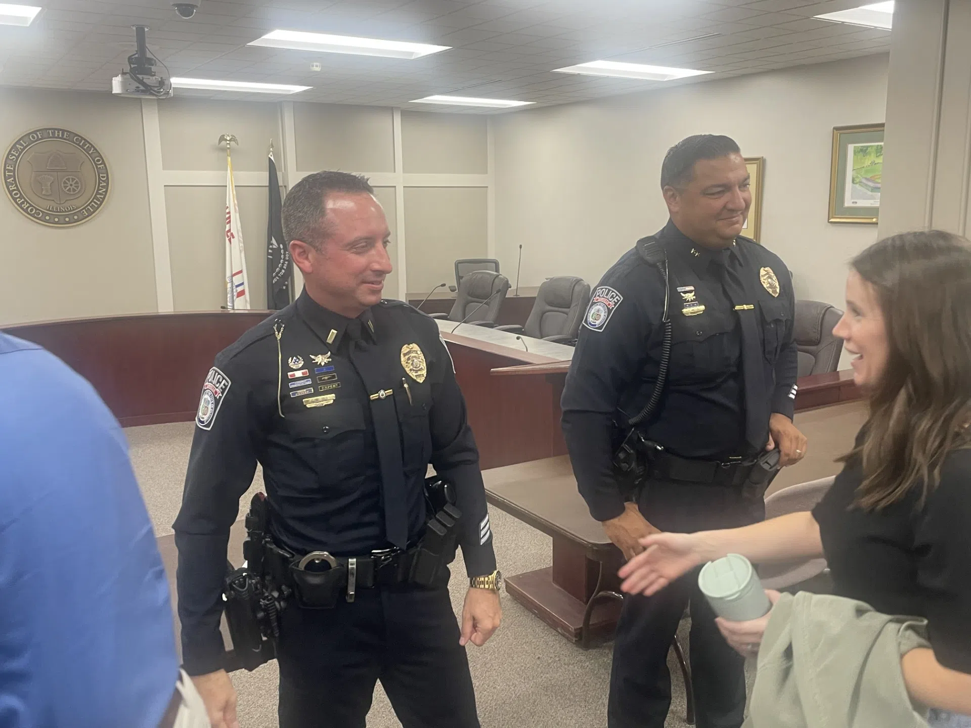 ABOVE: Lieutenant Jeffries and Deputy Chief Miller after swearing in ceremonies. Danville's City Council Chambers overflowed with family and police officers Tuesday (Sept 23rd) morning for the promoti...