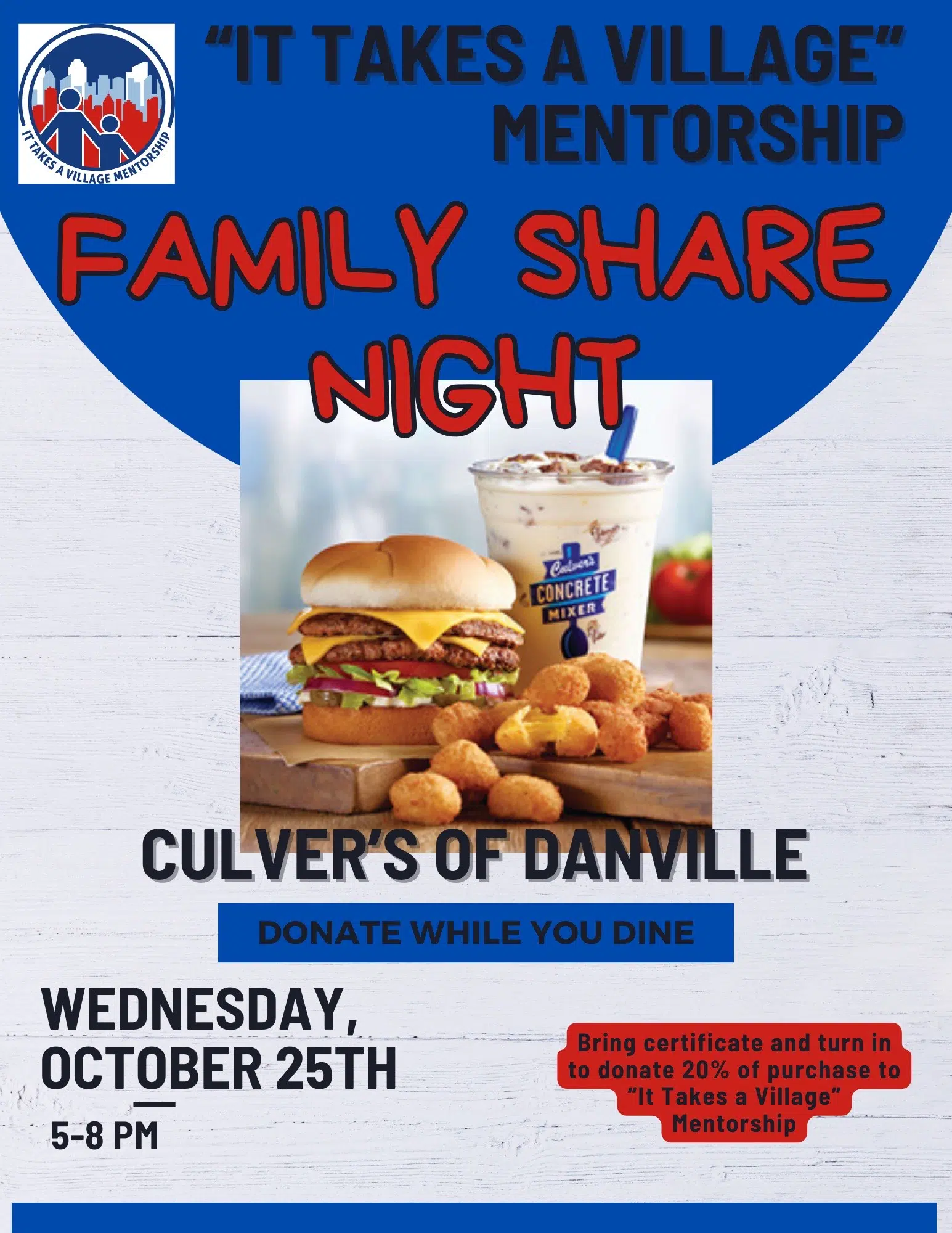 It Takes a Village Mentorship FAMILY SHARE NIGHT; 5-8 PM Wed the 25th at Culver's