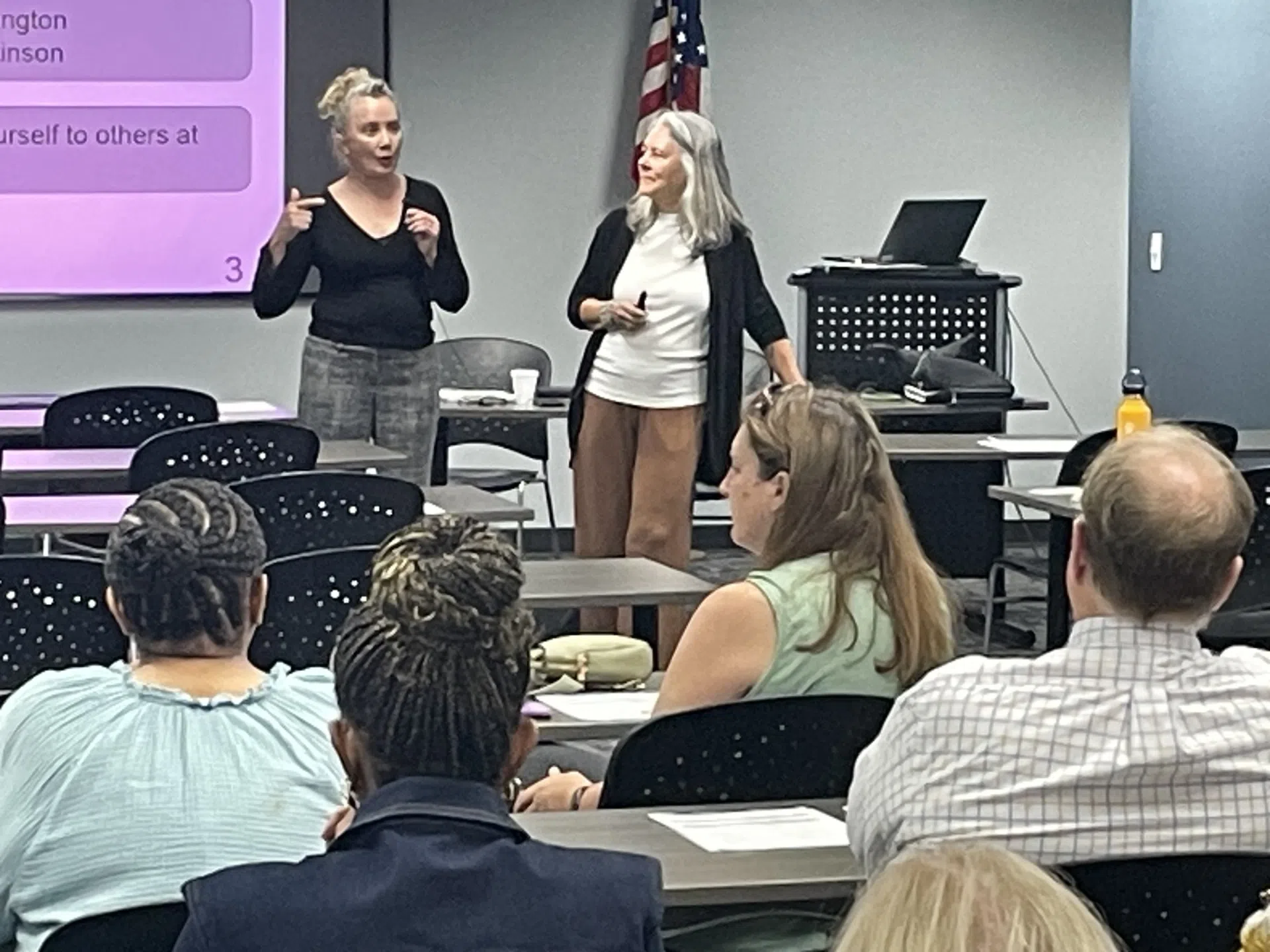 ABOVE: Rhonda Martinson, from Domestic Abuse International Programs in Duluth, Minnesota; and Martie Washington, from National Clearinghouse on Abuse in Later Life; explain a sample situation to those...