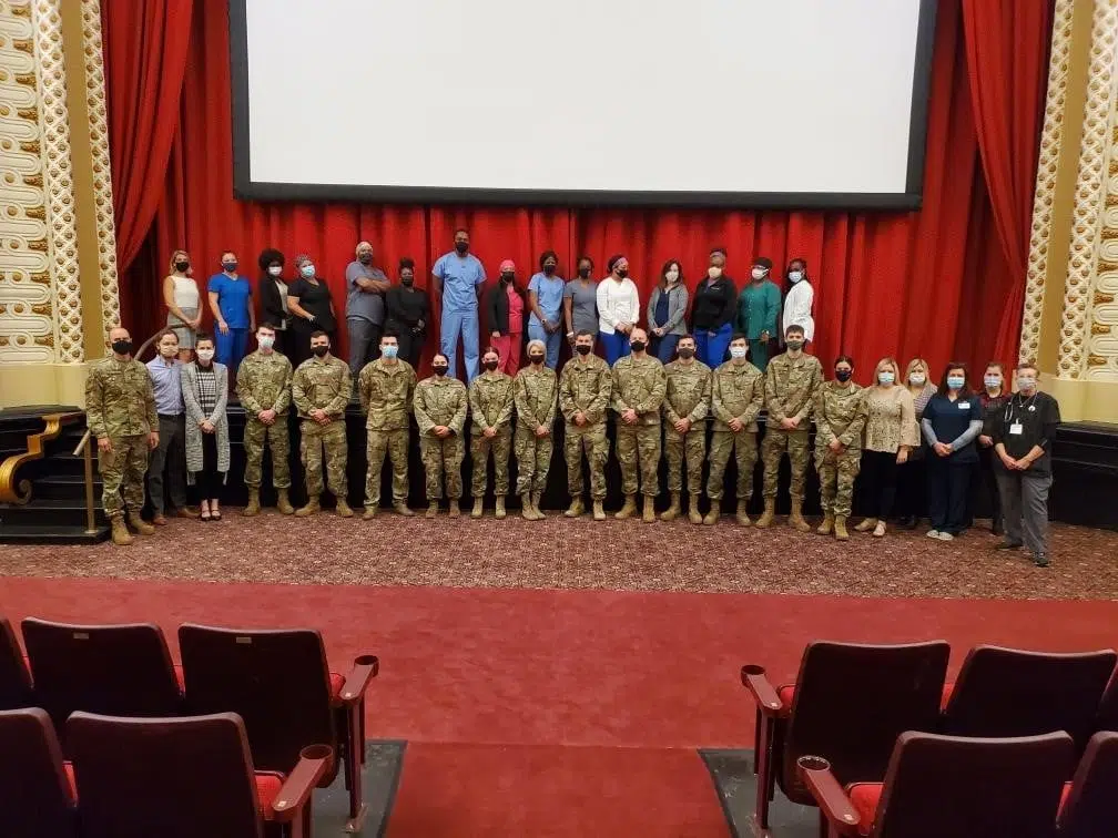 Michelle Mitchell Apr 09, 2021 Volunteer staff stand on the stage at the Fischer Theatre on Thursday (photo by the Vermilion County Health Department).