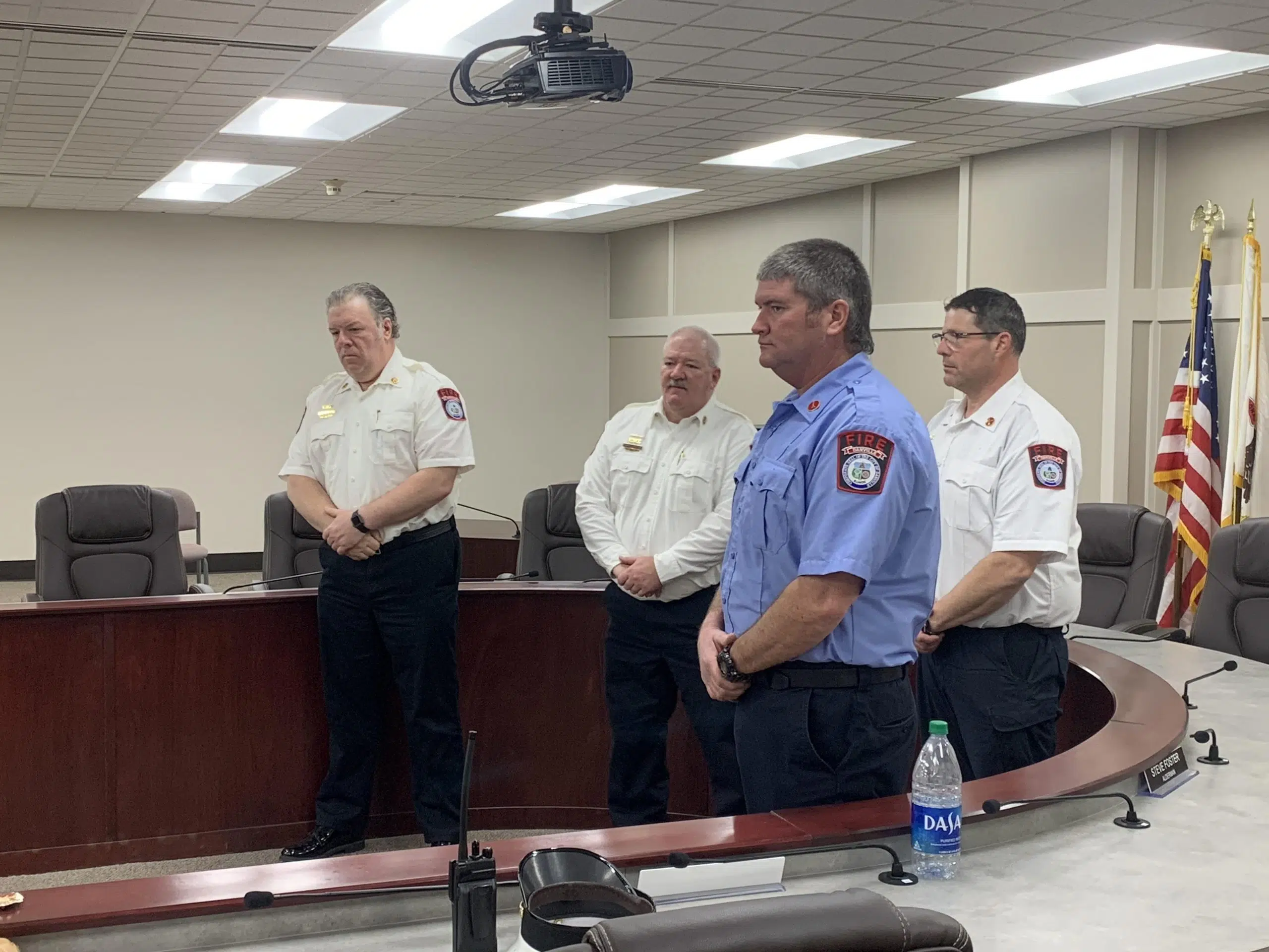 Michelle Mitchell Mar 03, 2021 Standing in city council chambers are Lt. Chad Busick (blue uniform), Assistant Chiefs Jerry Sparks and Tim Heinrichs and Captain Sean O'Kane (in white).